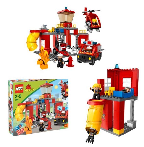 В наборе два человечка, пожарная машина, пожарный вертолет, собака и другие детали.