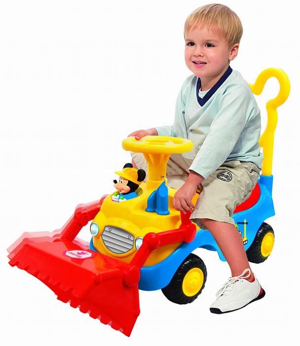 Каталка-пушкар Бульдозер - для маленьких любителей строительной техники. Большой ковш можно прикрепить, а можно снять. У каталки широкое сиденье (высота сиденья 18 см), высокая спинка в форме головы Микки Мауса, и самое интересное - панель управления. На руле гудок, звучащий как лай собаки. Рядом с рулем - экран с движущимися картинками (чтобы они начали двигаться, надо нажать кнопку). Есть маленькая магнитола с двумя кнопками - при нажатии на них играет музыка. Ключ зажигания в форме головы Микки Мауса - при повороте ключа слышен звук работающего двигателя.
