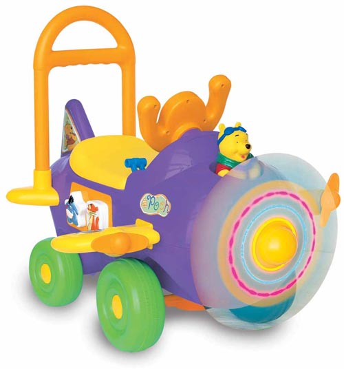 Каталка-пушкар *Винни* с пропеллером выполненнена в стиле популярного мультфильма студии DISNEY, развлечет малыша мигающими огоньками, песенкой Микки, приятными мелодиями, забавными звуками, а также реалистичным звуком двигателя и разноцветными узорами, которые создает вращение пропеллера. На панели управления размещены *навигационные приборы*.
