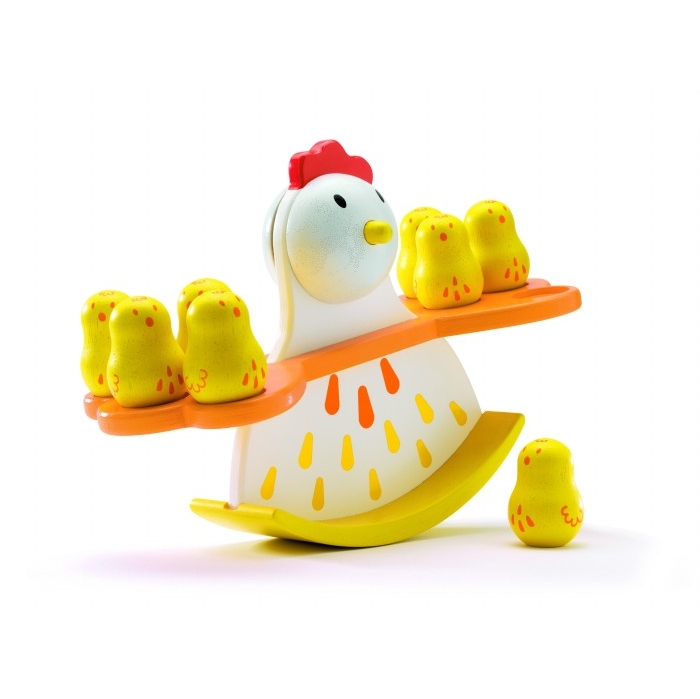 Деревянные весы-балансир Курочка. На каждой стороне сидят по 3 птенца. Снимая или сажая птенцов к маме, помоги остальным цыплятам не упасть!