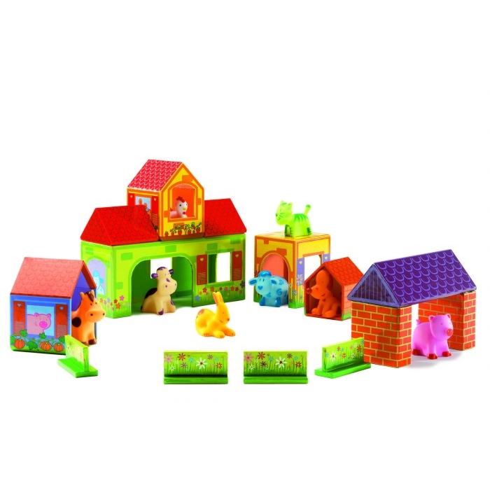 В комплект входят 14 кубиков и 8 фигурок животных.